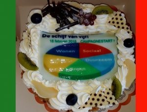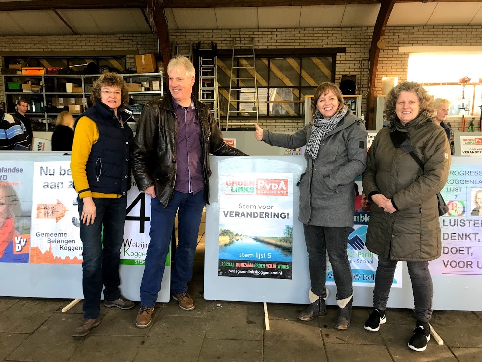 Op boerderij de  Nieuwe Proef te Wogmeer ontvingen de kersverse kandidaten van PvdA GroenLinks Koggenland geïnteresseerde kiezers. Onder het genot van verse koffie en thee en velen zelfgemaakte taarten vierden de lijstcombinatie PvdA GroenLinks, met steun van D’66, het heugelijke feit dat ze meedoen met de verkiezingen. De taart met de Schijf van 5het verkiezingsprogramma – werd door de jongste bezoeker aangesneden.