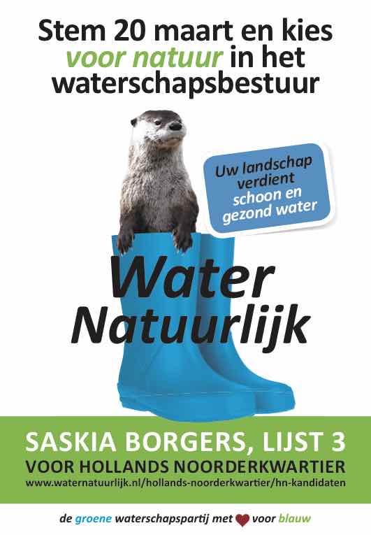 Met deze tekst gaat onze fractievoorzitter de waterschapsverkiezingen voor Water Natuurlijk in. Water Natuurlijk is een vereniging die in 2008 is opgericht om de belangen van natuur, milieu, landschap en recreatie in de waterschappen beter te kunnen beschermen. Een landelijke vereniging, met fracties in alle waterschappen. Saskia is naast haar politieke werkzaamheden ook bestuurder van Stichting Duinbehoud die ons mooie duinlandschap beschermt.